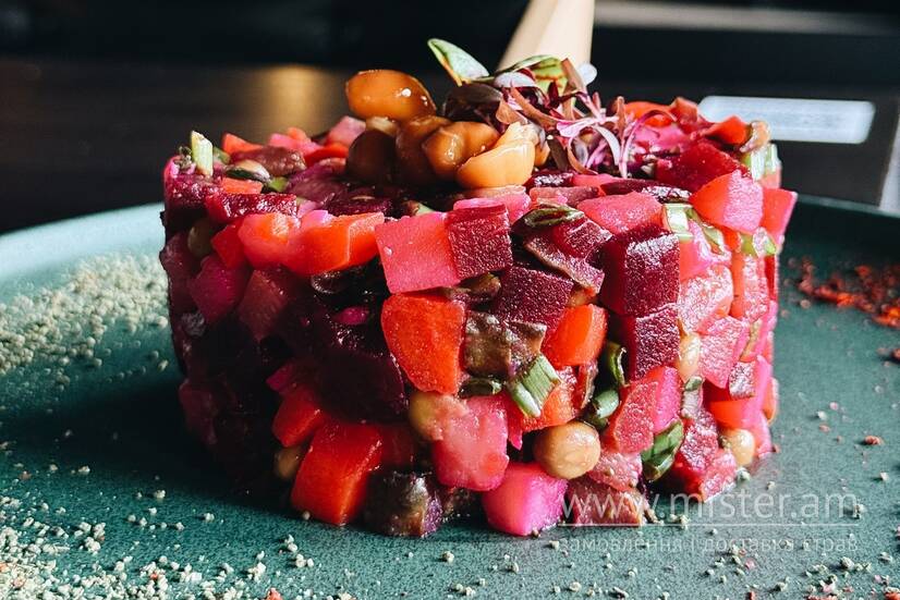 Легкий, свіжий та вітамінний салат на основі айсбергу, салатного листя та руколи у поєднанні зі стиглим авокадо та томатами чері. Заправляється оливковою олією та поливається соусом Песто.