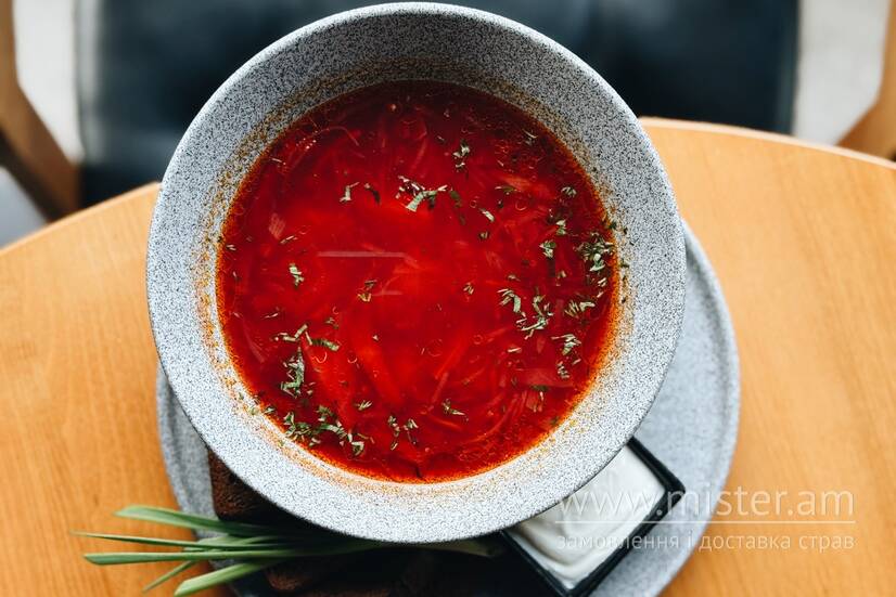 Класичний пісний борщ на овочевому бульйоні. Подається зі свіжою зеленою цибулею, бородинським хлібом та веганською сметаною.