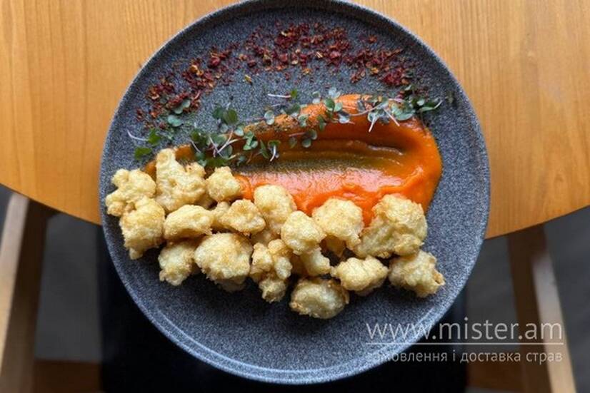 Смажена цвітна капуста в клярі темпура з пікантним морквяним мусом з додаванням перцю чилі.