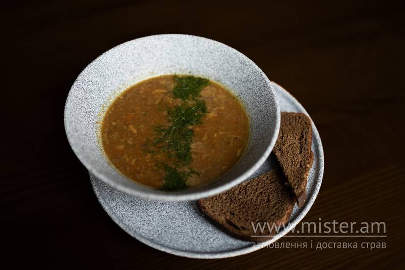 Насичена юшка на основі сушених білих грибів у поєднанні з морквою, цибулею та ароматними спеціями. Подається з бородинським хлібом та свіжою зеленню.