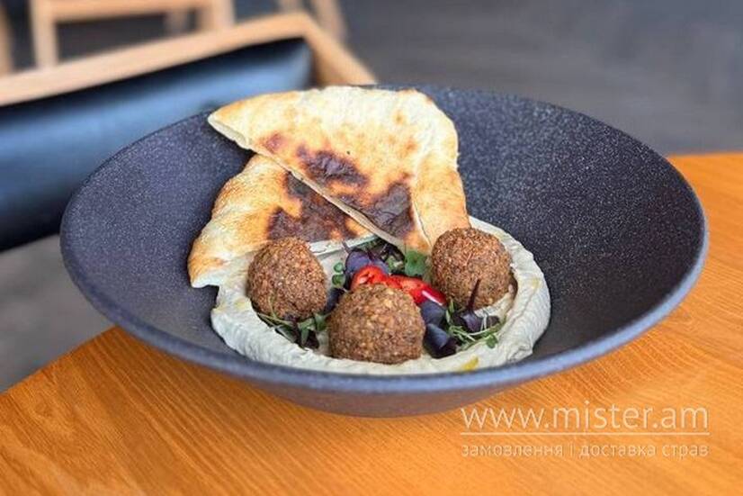 Класичний хумус з хрустким фалафелем. Подається зі свіжоспеченою пітою.