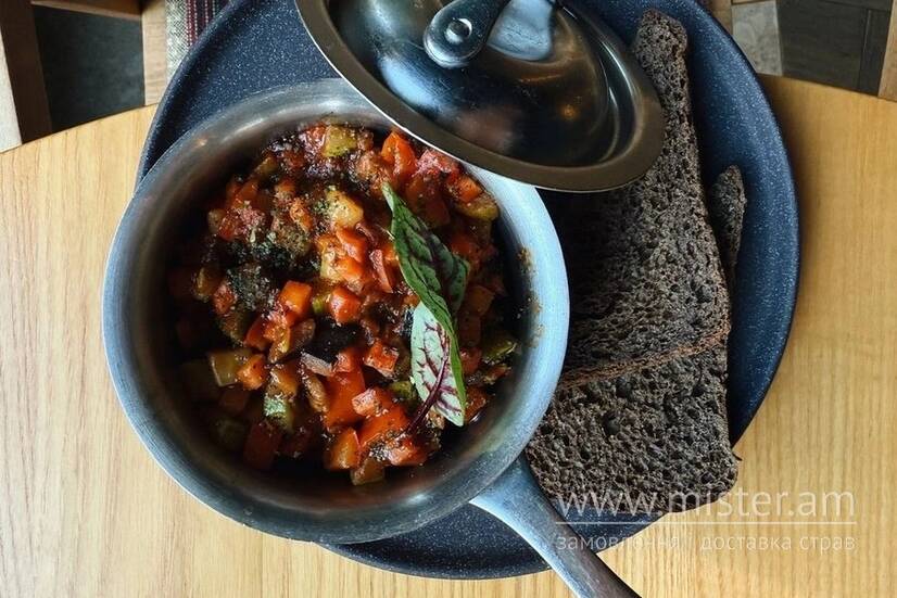 Тушковані овочі — баклажан, болгарський перець, цукіні, томати та печериці, у соусі томатний чілі. Подається з бородинським хлібом.