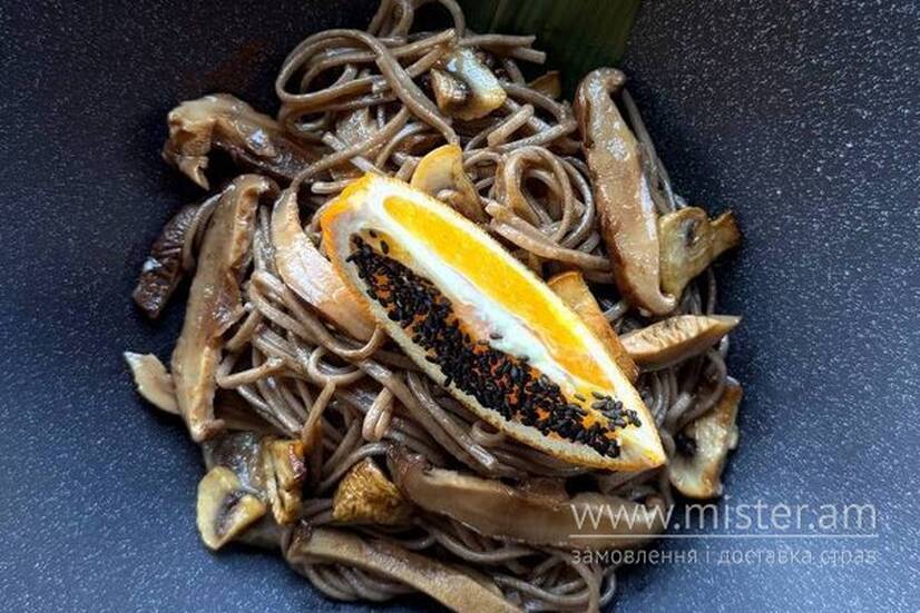 Гречана локшина з грибами шитакі, печерицями та лісовими грибами. Заправляється соєвим соусом та соусом солодкий чилі.