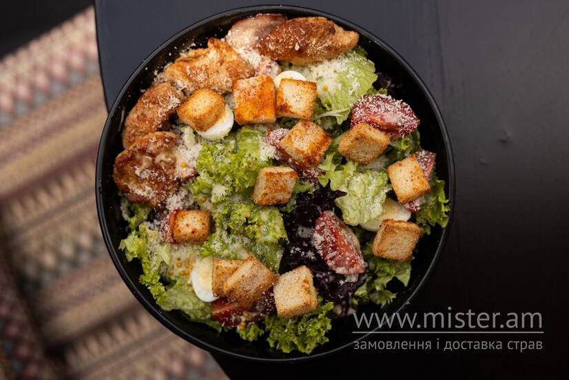 Мікс салатного листя, фірмовий соус, помідори чері, перепелині яйця, філе індички, бекон, сир пармезан.