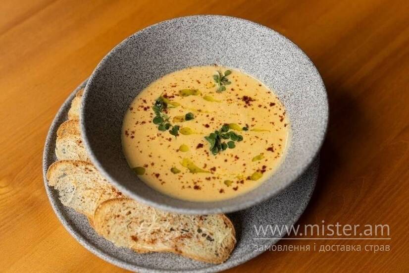 Крем-суп з гарбуза, на основі вершків з додаванням спецій (мускатний горіх,паприка) та зеленої олії. Подається з хрусткими слайсами чіабати з пармезаном.