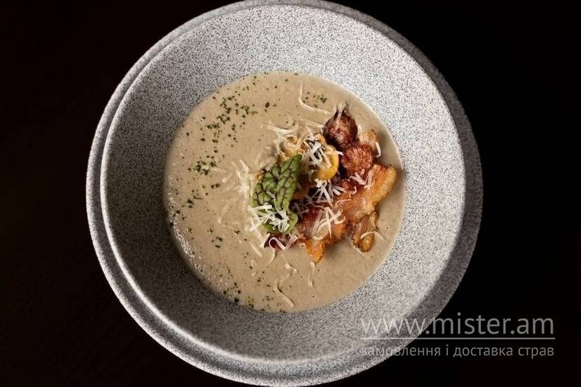 Класичний крем суп на основі білих грибів та печериць, з додаванням трюфельної оліі та пармезану. Декорується хрустким беконом.