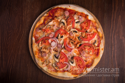 Індиче філе, куряче філе, сир Моцарела, мисливські ковбаски, печериці свіжі, цибуля червона, томати, соус томатний