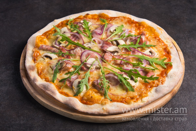Бекон, цибуля червона, печериці свіжі, ковбаски мисливські, рукола, сир пармезан, соус часниковий, олія оливкова
