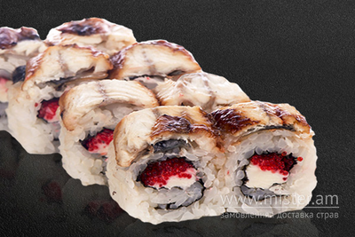 Вугор, рис, норі, унагі, кунжут, крем-сир, огірок, ікра тобіко. Васабі, імбир.