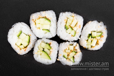 Норі, рис, огірок, кунжут, соус унагі. Васабі, імбир.