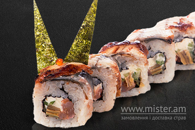 Вугор, соус унагі, крем-сир, кунжут, огірок, рис, норі. Васабі, імбир.