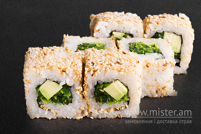Норі, рис, спайсі майонез, чука, огірок, авокадо, кунжут. Васабі, імбир.