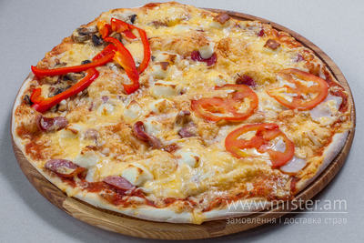 Курка, салямі, мисливські ковбаски, перець, помідори, гриби, моцарела, сир