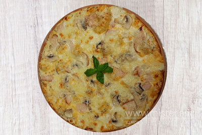 Курка, гриби, сир моцарела, сир пармезан, сир твердий, вершковий соус.