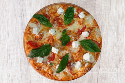 Сир фета, помідори, сир моцарела, сир твердий, базилік свіжий, томатний соус.