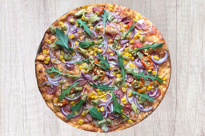 Томатний соус, мисливські ковбаски, пепероні, кримська цибуля, кукурудза, сир тертий, моцарела.