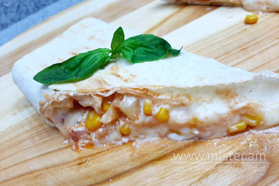 Сир сулугуні, помідори, зелень, соус на вибір.