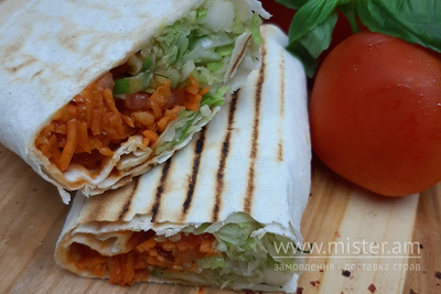 Морква по-корейськи, салат, помідор, соус на вибір.