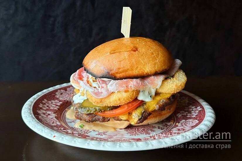 На булочку поливається соус до бургера та викладаються салат айсберг, томати, мариновані, обсмажена в хоспері котлета з сиром чеддр та слайсами шолдера, чіпсом бекону, цибулеві кільця, цибулеві кріспи та поливається сметанно-часниковим соусом.