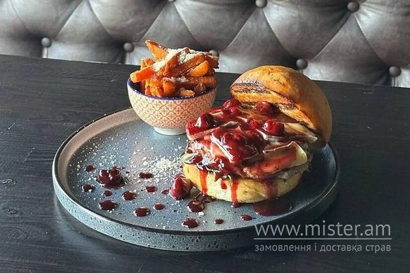 Хрумка булочка з цибулевим комфітюром, котлета з міксу свинини та яловичини під сиром камамбер та з додаванням вишневого BBQ. Подається з бататом фрі під пармезаном.