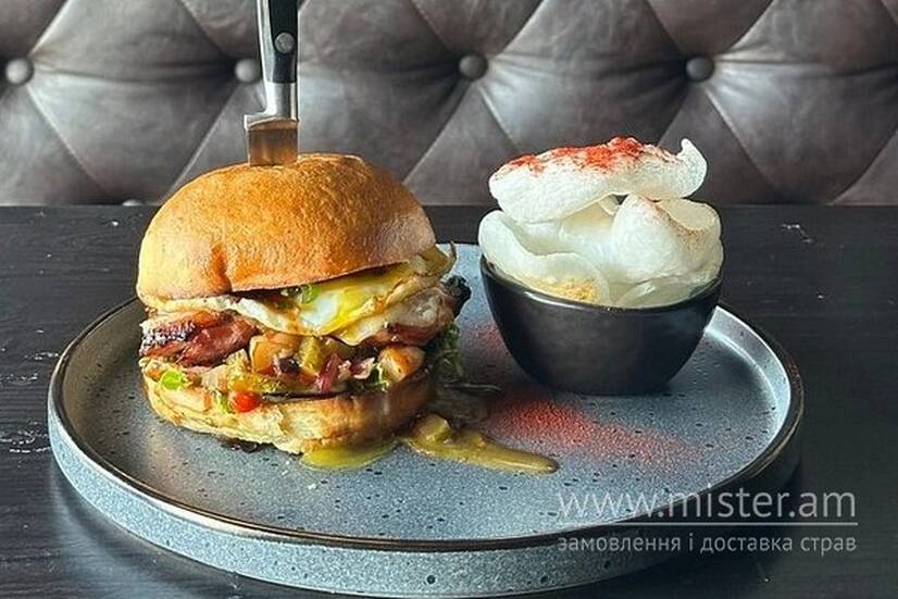 Хрустка булочка з обмажиним в хоспері стегном, spicy овочами та яйцем глазунью з додаванням гострих огірків та зеленої цибулі. Подається з рисовими чіпсами та соусом солодкий чилі.