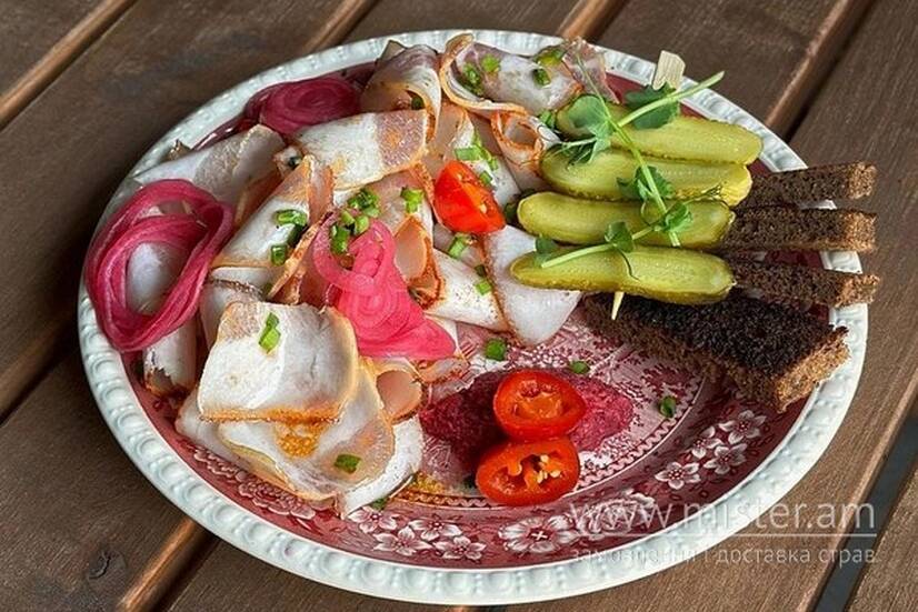 Дошка з двома видами сала, мариноване та копчене в спеціях, подається з хрумкими грінками, маринованою цибулею, маринованими огірками та гірчичним соусом.