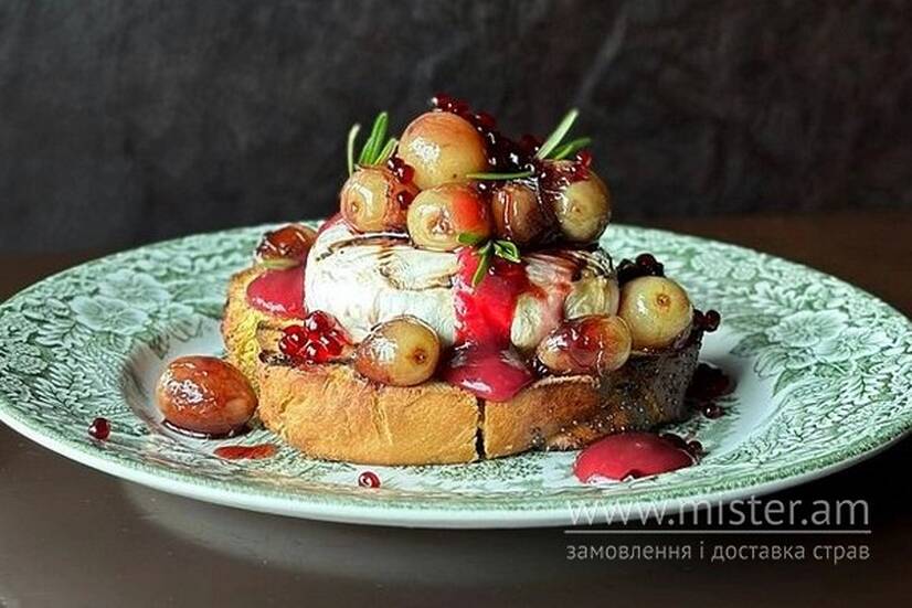 На хрусткій Халі подається запечений камамбер гриль з виноградом в карамелі з червоного вина та винною ікрою. Прикрашається ароматним розмарином.