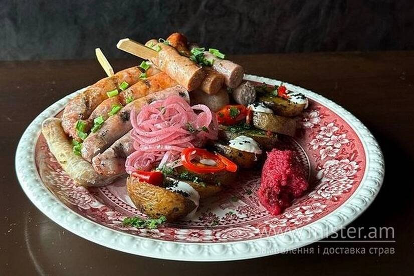 Асорті з ковбасок смажаться в хоспері, подаються з смаженою картоплею та хрусткою пітою, сметанной-часниковим соусом та домашнім хріном.