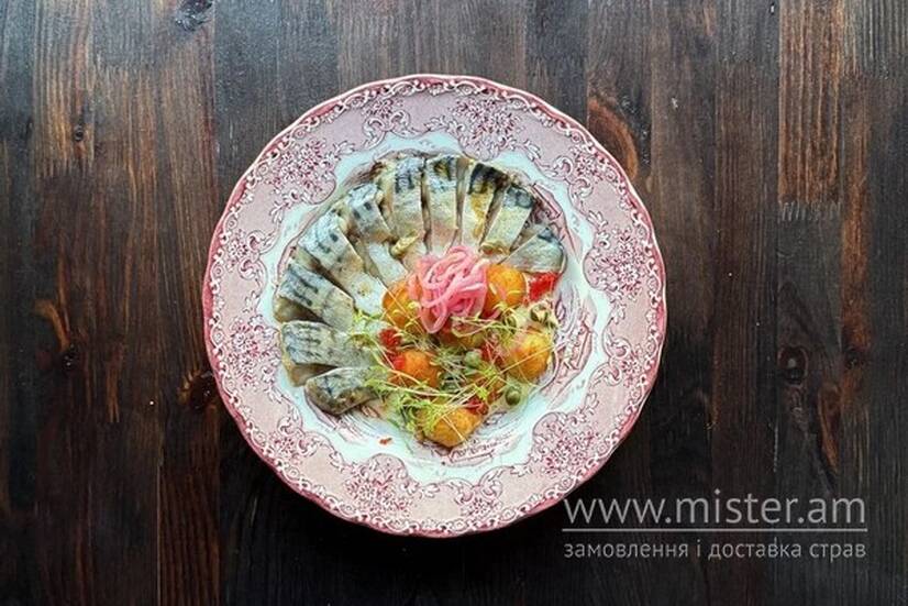 Філе скумбрії власного приготування з соусом «вітело тонато», кульками картоплі та грінками з бородинського хліба/