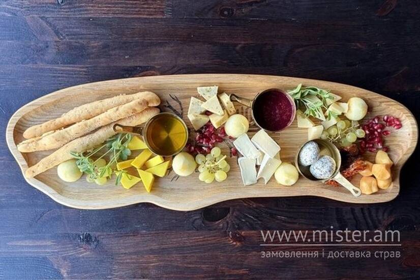 Закуски: Панкейки з солоного сиру з лососем, Вітело Тонато, Тар тар з яловичини, Тар тар з лосося, Форшмак з макрелі власного виробництва, Великий сет закусок, Мухамара, Фірмове сало від шефа, Паштет Данський, Соління, Бастурма, Камамбер гриль, Макрель шеф посолу з картоплею, Вушка, Фруктова тарілка