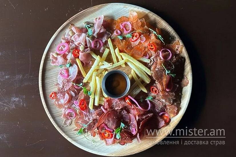 Три вида крафтового м`яса з картоплею фрі та соусом BBQ.
