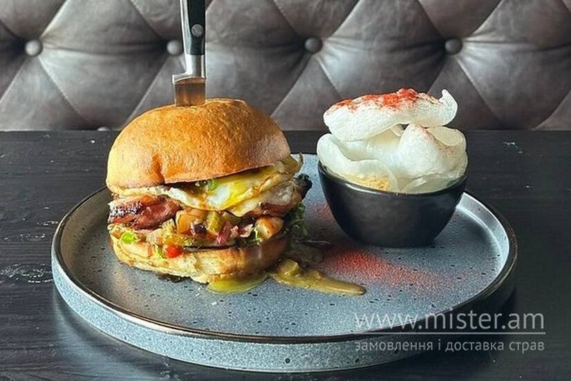 Хрустка булочка з обмажиним в хоспері стегном, spicy овочами та яйцем глазунью з додаванням гострих огірків та зеленої цибулі. Подається з рисовими чіпсами та соусом солодкий чилі.