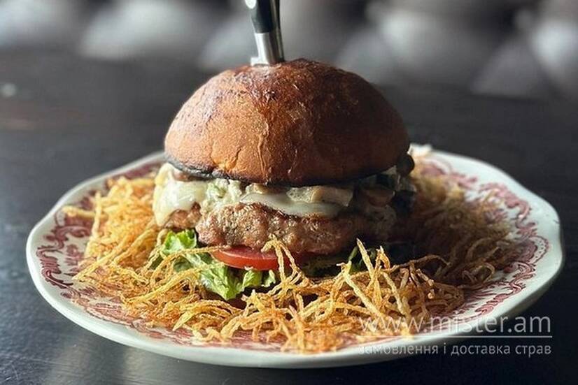 Хрумка булочка, котлета з міксу свинини та яловичини з додаванням грибної підсмажки по-закарпатськи в поєднанні з крафтовою бринзою та свіжими овочами. Подається з та хрумкою картоплею пай.