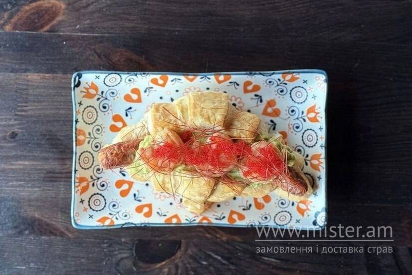 Хот-дог в круасані, з крафтовою сосискою, соусом спайсі, гуакамоле та ніжною креветкою.