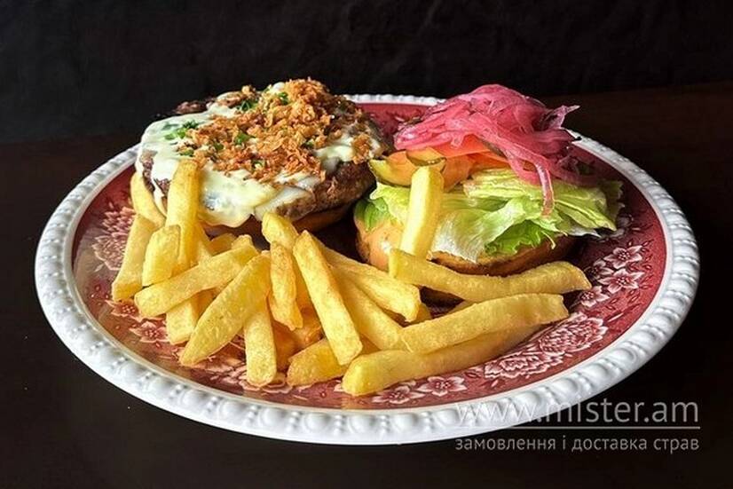 На булочку поливається соус до бургера та викладаються салат айсберг, томати, мариновані огірки та цибуля. На другу частину булочки поливается сирний соус та викладається обсмажена котлета в хоспері з сиром моцарелла. Котлета посипається цибулевими кріспами та мілко рубленою цибулею. Бургер подається з картоплею фрі.