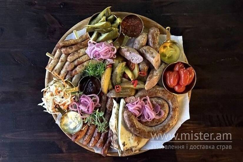 Асорті чотирьох видів крафтових ковбас з картоплею по-селянськи, соліннями та грінками бородинського.