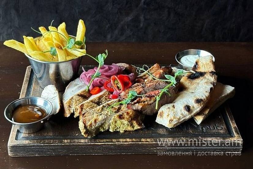 Два вида м`яса обсмажені в хоспері (ошийок зі свинини та філе з індички), подаються з картопляними діпами в сирному соусі, пітою та двома соусами BBQ, сметанно-часниковим.