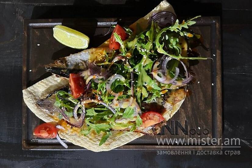 Пряне фІле скумбрії обсмажене в хоспері. Подається на хрусткій піті з руколою свіжими томатами чері та маринованою цибулею під соусом медово-гірчичний.