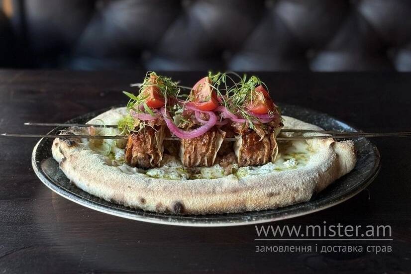 Кебаб яловичого фаршу на лаваші та соусом Барбекю, подається на хачапурі з томатною сальсою та чері.