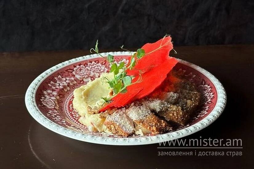 Куряча грудка обсмажується в горіховій паніровці з пармезаном та грецьким горіхом. Подається з вершковою пюрешкою.