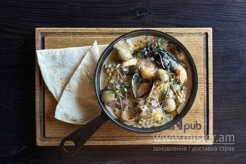 Креветки, мідії, зірка кальмара та маринований сом під соусом том ям, пітою та оливками гриль.