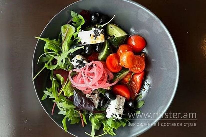 Класичний грецький салат з заправкою на основі оливкової олії та лимонного фрешу, з додаванням зернової солодкої гірчиці, маринованої цибулі та крихтою в`ялених маслин.