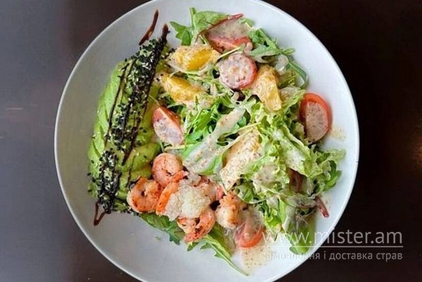 Пряні смажені креветки в поєднанням з сегментами апельсину, міксу салату, томатами чері та авокадо з горіховою заправкою та унагі.
