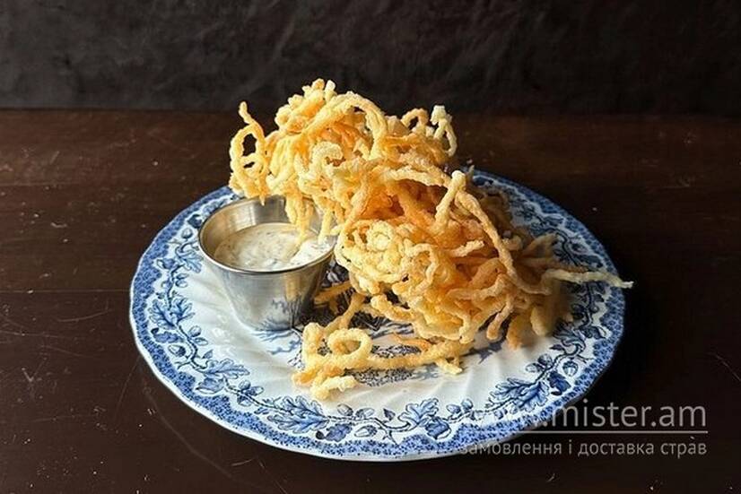 Смажений сир косичка подається з сметанно - часниковим соусом.