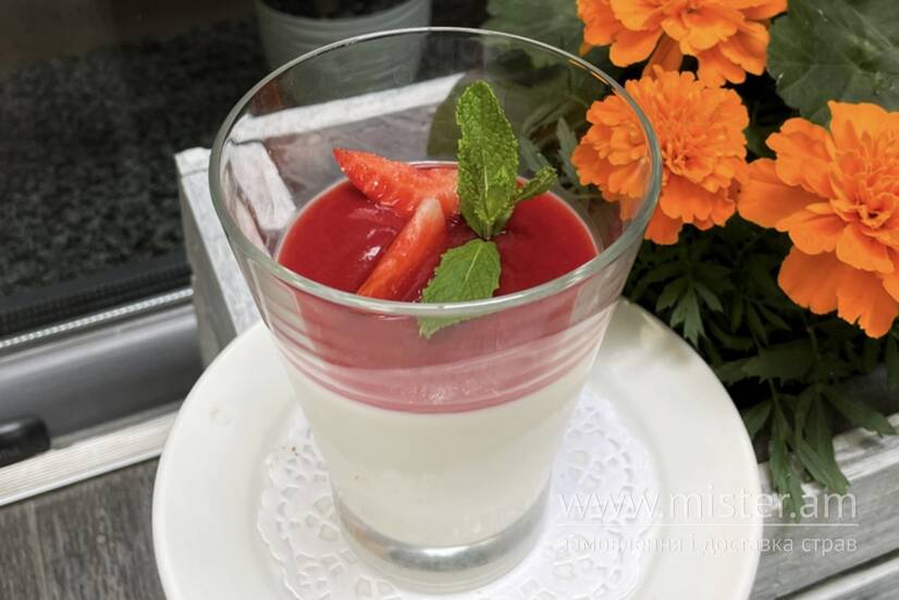 Італійський десерт з вершків, молока, цукру і желатину з полуничним соусом.