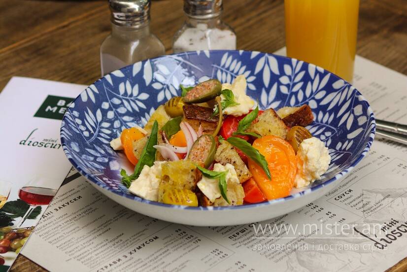 Яскравий італійський салат на основі томатів Мікадо та чері, з ароматним базиліком, ніжною цибулею та хрусткими крафтовими гріночками.