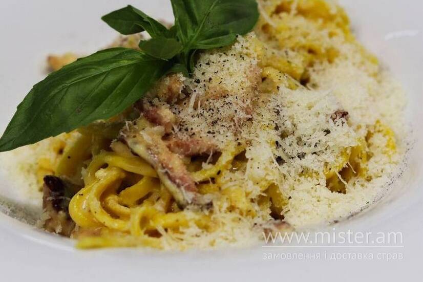 Паста спагетті з вершковою основою, беконом, прошуто, замішується жовток, посипається пармезаном та прикрашається базиліком.