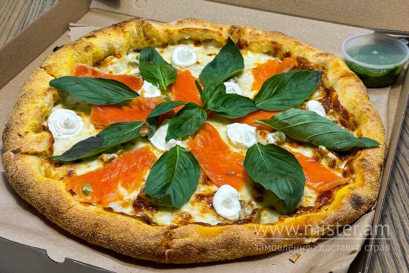 На вершковій основі, з сиром моцарелла, оливками, при подачі викладається слабосолений лосось, крем-сир та базилік.