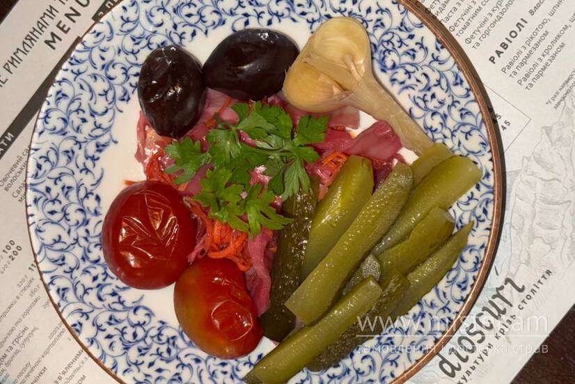 Холодні закуски: Брускета з моцарелою та томатами, Намазка з цукіні та фаршированими перцями , Малосольні помідори, Малосольні огірки, Тарілка зелені, Сало “Lardo" NEW!, Брускета з лососем та страчателлою, Намазка з білих грибів з в‘яленими томатами та фундуком, Закуска з баклажана з соусом тахіні та сиром фета, Паштет з курячої печінки по-італійськи, Скумбрія власного посолу, Антипасті, М`ясна тарілка, Вітелло Тоннато, Асорті сирів з медом та грісіні, Квашені огірки, Квашені помідори, Бадріджані з сиром