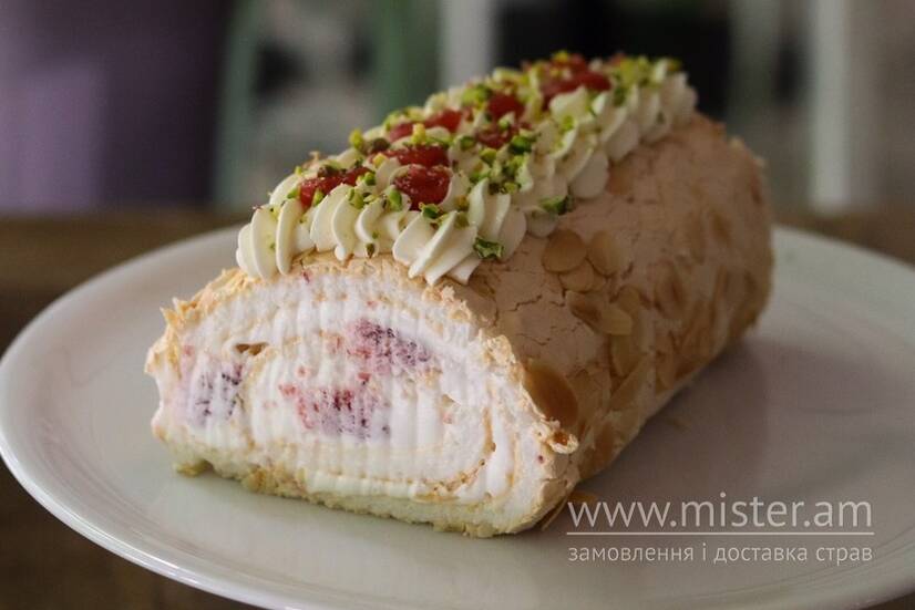 Меренговий білий рулет з маскарпоне та полуничним конфі